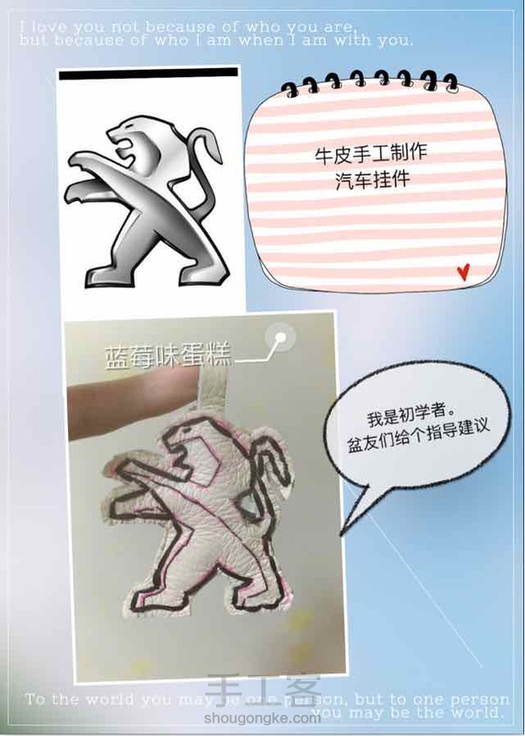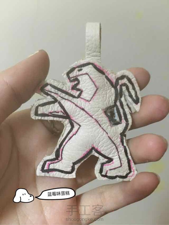 好累啊。做完蛮有成就感。汽车挂件。 用牛皮做的,没有打孔机。用锥子钻的。手好疼。 缝制线还是不太会。凌乱。希望有人能指导我一下,谢谢!