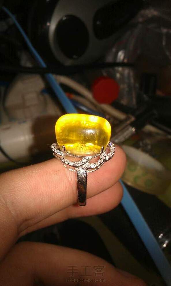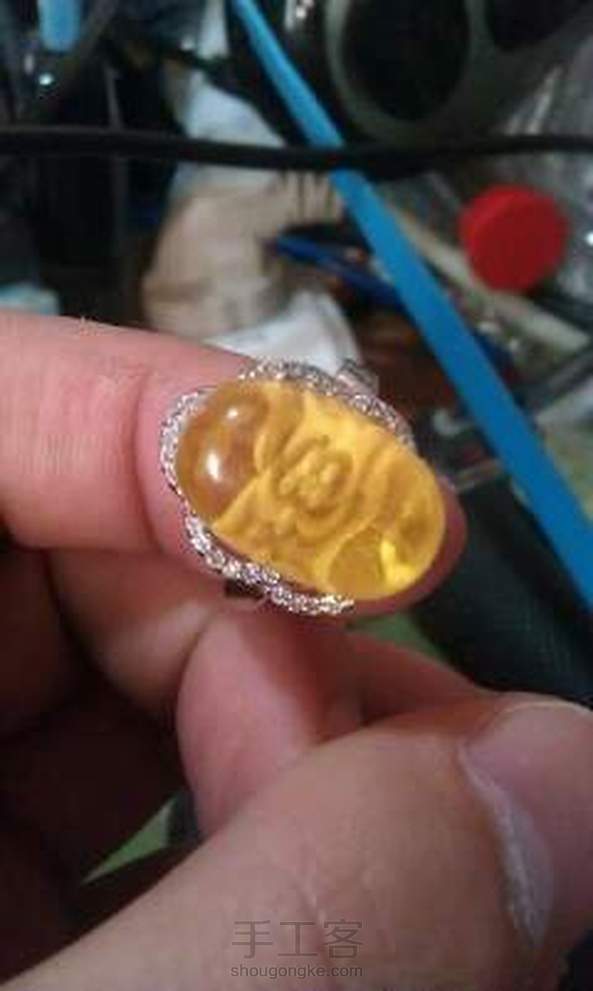 金珀阴雕小花戒指
