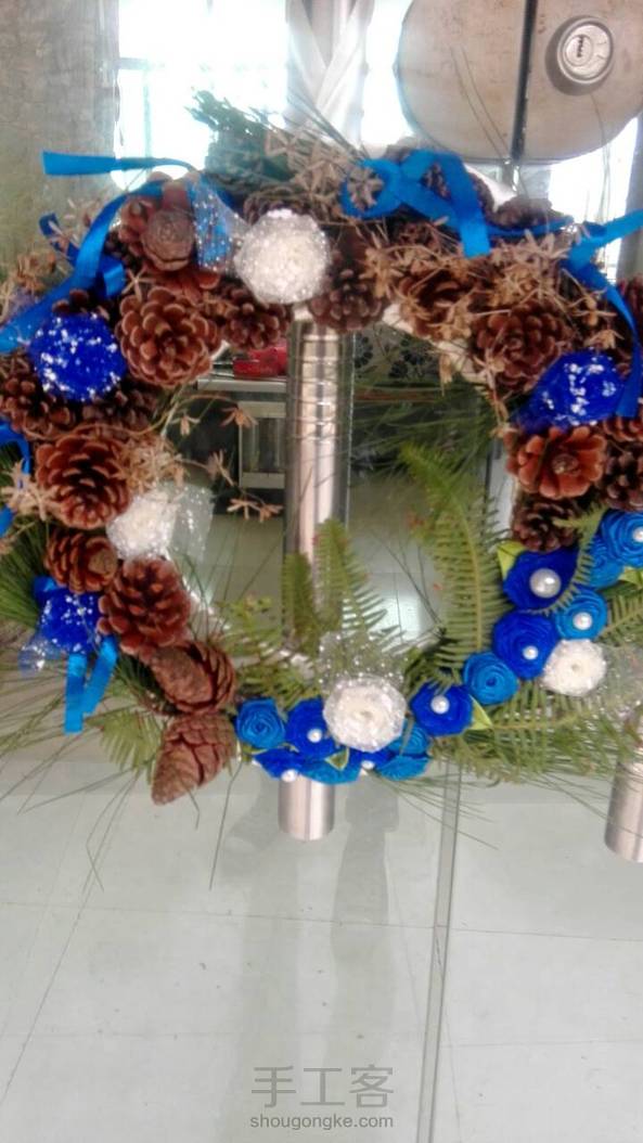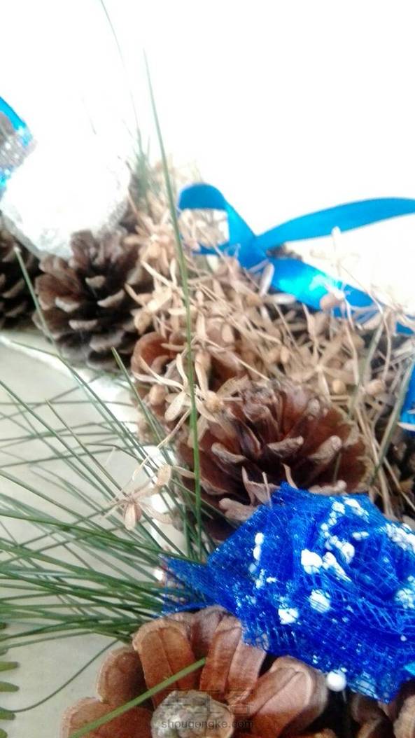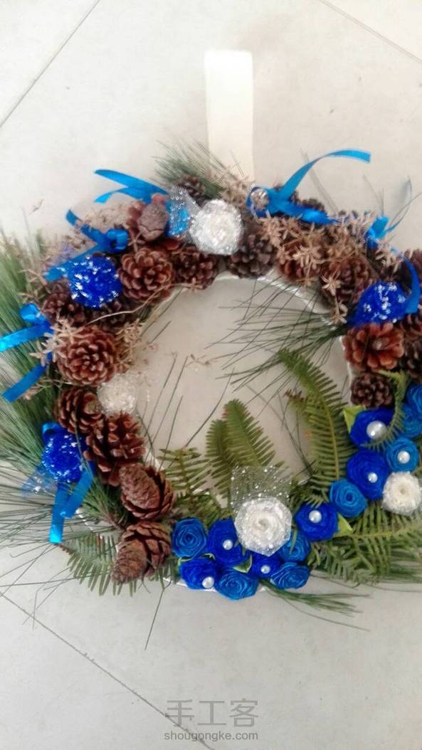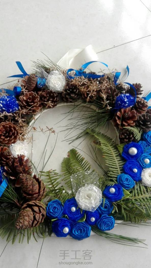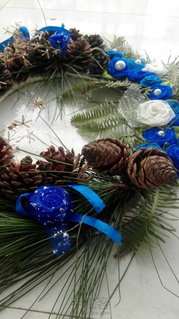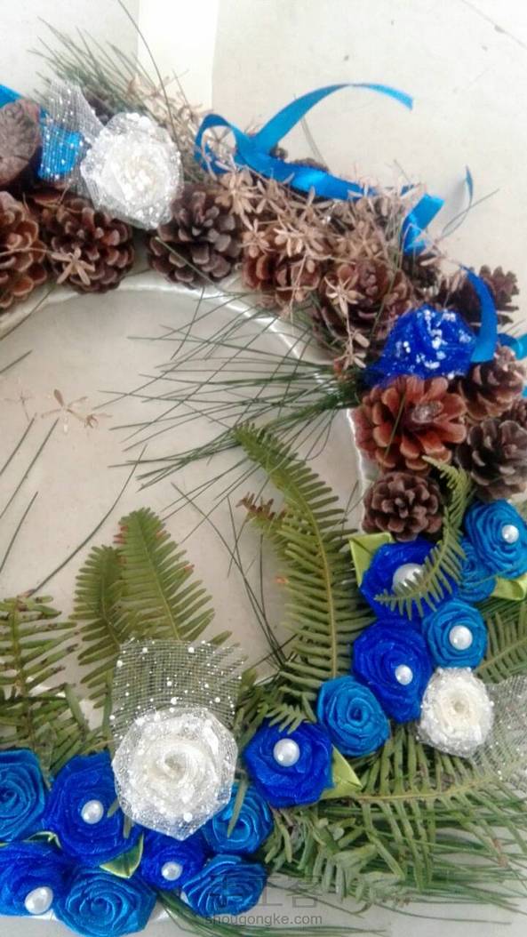 闺蜜和我喜欢的蓝色,所以这个作品就出来了,我也很喜欢呐,但是结果还是闺蜜拿走了。下面我解释解释怎么做的,还是一样,纸圈,绕上丝带,记得一定要黏一块丝带出来,好挂墙上。然后黏上树枝,树叶,松塔,丝带花,丝带花上黏几个珍珠片,周围加上小号的丝带蝴蝶结。然后就搞定了。