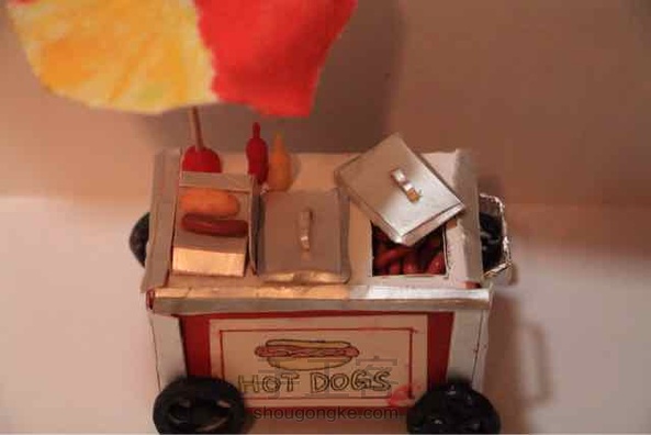 纯手工的热狗车~木有木板用的硬纸板和乐事薯片筒,伞是裁的旧校服,热狗是软陶做的