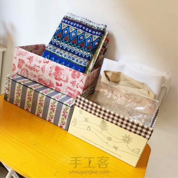 鞋盒子和蛋糕盒子贴麻布改造收纳盒,布料没有贴满有点浪费布😌很实用很节俭很漂亮哦