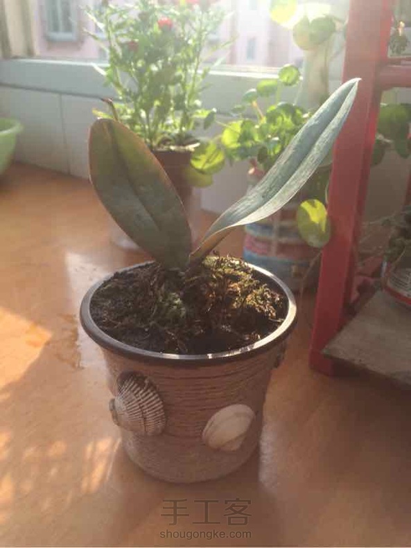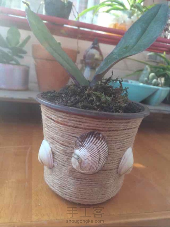 家里没有多余的花盆了,仅剩一个小且薄的塑料花盆,用麻绳装饰了下,贴上贝壳立刻就小清新了。贝壳是吃饭时餐桌上带回来的,当时服务员看着我,羞的我老公呀,我当时是把脸揣裤腰带里了。事实证明,脸揣裤腰带有时未必不是坏事。哈哈