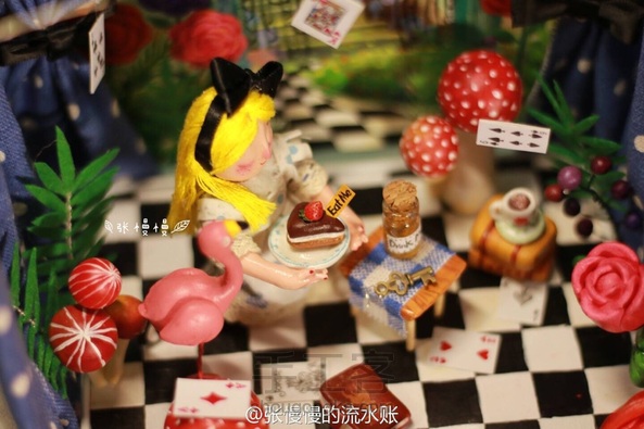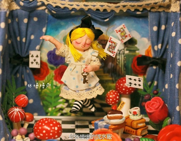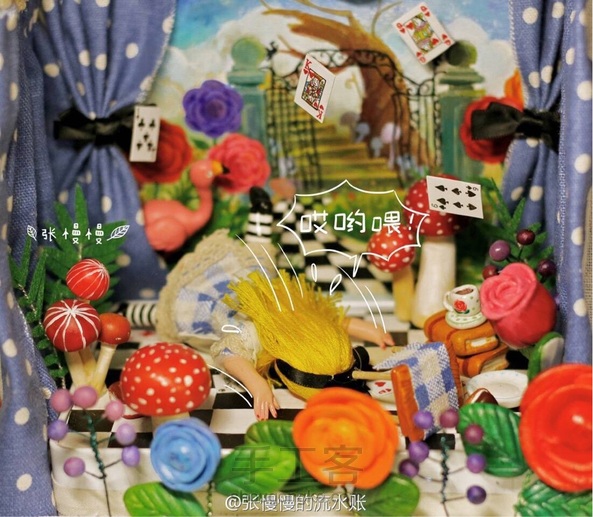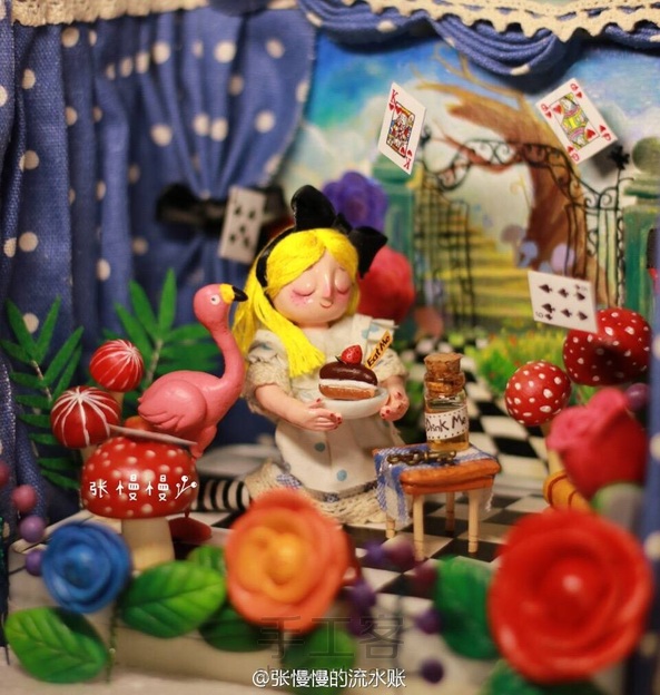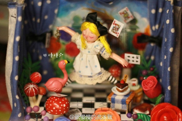 跳舞的爱丽丝 娃娃:石塑粘土 小道具:超轻粘土 背景:丙烯 爱丽丝:“舞台做太小了伸展不开呀”(๑°⌓°๑)