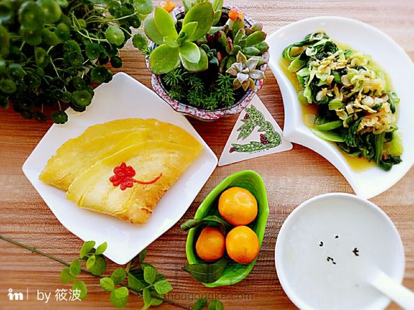 早安!20170314早餐记录~鸡蛋甜饼+蒜香油菜+白粥+橘子