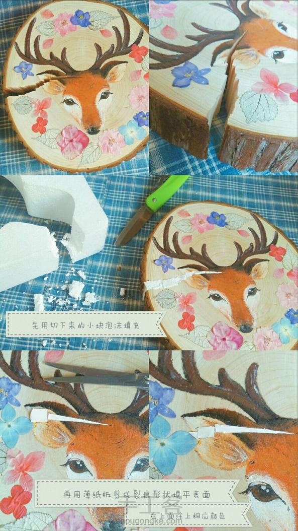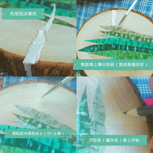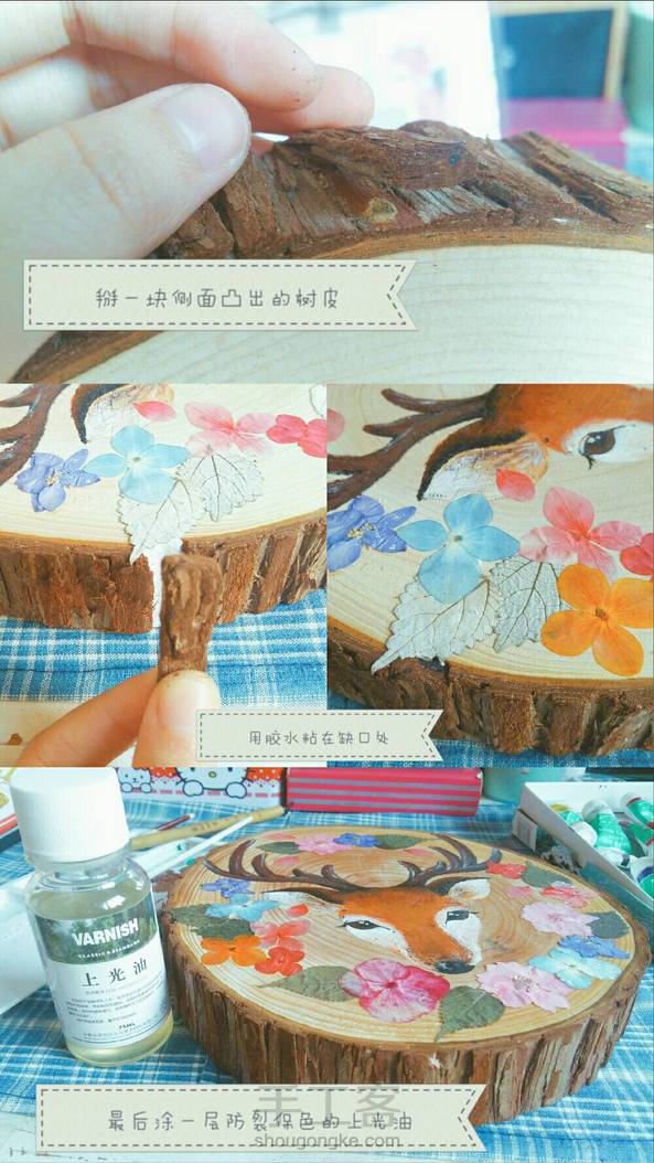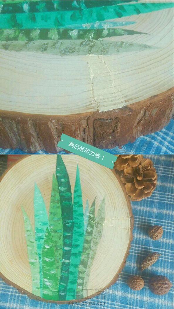 【机智如我】这片木片之前没处理好受潮了,后来又被我无意间晒到了,于是它无法阻挡的裂开了,心疼我已经在上面画好了,于是想办法补救,其张力非常大不可能用外力使其合并,还好我聪明,详情如图,最后刷层上光油,给自己点个赞!还是蛮有成就感哒。