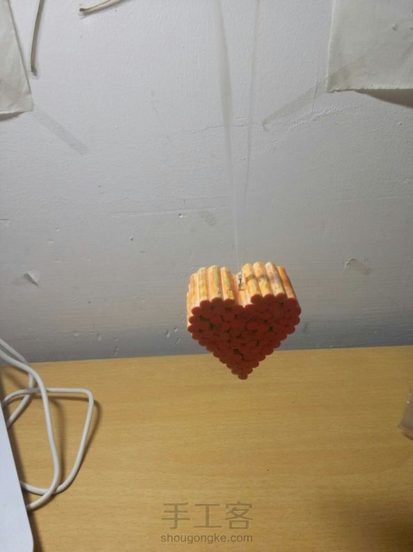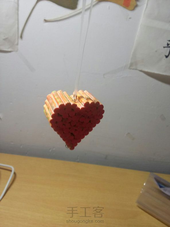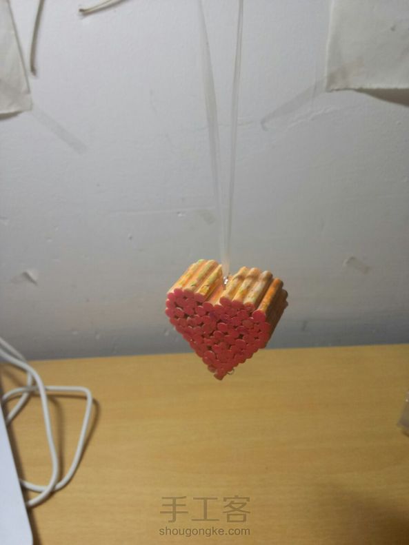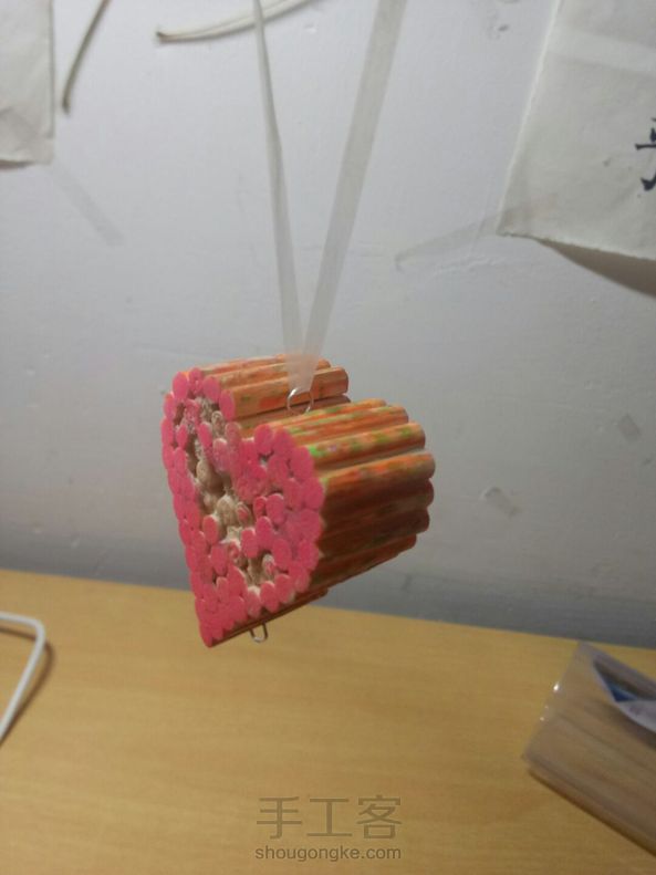 做手工时剩余的筷子边角料制作心形挂件,简单又好看,可惜如果有个吊穗就完美了😄