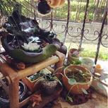 老家不要的竹凳,吃剩的佛跳墙的罐子,麻麻武夷山旅游带回来的老酒瓶子,碎掉的炖罐,路边捡回来的木头,组成我的水生植物小园。