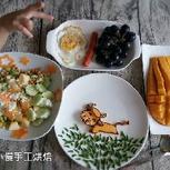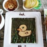 6.4早餐:玉米渣子粥,菜椒萝卜干炒蛋,樱桃,李子,恐龙(青瓜,肉松,黑巧,樱桃) 源自当当的手工美术作品《噢,恐龙》