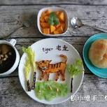 5.31早餐:酥香面包,海带黄豆猪皮汤,芒果,十二生肖之虎(芒果,面包,西芹,黑巧,蕃茄汁) “从前,森林里来了一只又大又饿的大虫子!是什么呢?” “嗷~~嗷~~” “原来是一只凶猛的老虎,它要去找一些东西来吃…………”