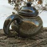 自己平时喝茶用的一把小壶,简单的掇球壶样式,除了壶身为拉坯,其余部分与紫砂壶做法大同小异,施以茶叶末釉色,自认很古朴!拿出来与得天独厚的冰天雪地、枯木落叶配上一配,也让大家欣赏下他