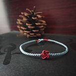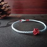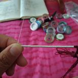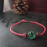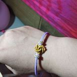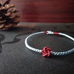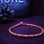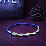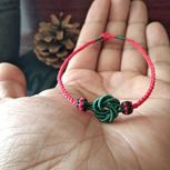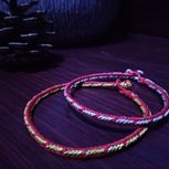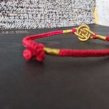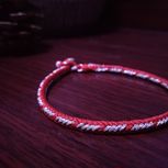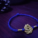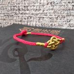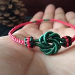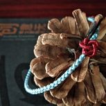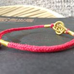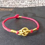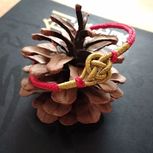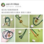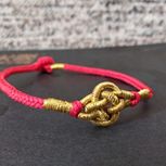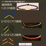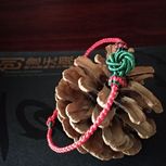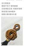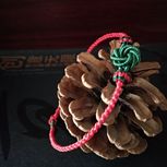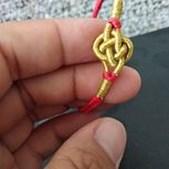 用线:72号红色2m4对折,掐中间取四根做金刚结两厘米,弯成圈,两边各取两根做一个蛇结固定,编八股辫6.5cm,3股金线绕线约0.8cm,两边再各取两根做蛇结一个,分成两股(各四根)绕三股金线5-6cm(我绕了5cm,做出来双钱结有点儿紧),编一个蛇结加绕线0.8cm,继续编完八股辫,绕线0.5cm,纽扣结收尾(我取四根做的纽扣结配扣头刚好)。