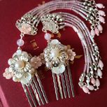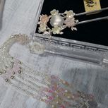 发梳一对,银色打底,配珍珠、贝壳花,略带了点少女风。我一向很少做银色系的,一来不会配色。虽说银色百搭但对于我来说一涉及配色的瞬间就会懵圈。二来,对于一个奔三的老阿姨来说,这粉粉嫩嫩的少女风真的不是很有灵感的。😅😅