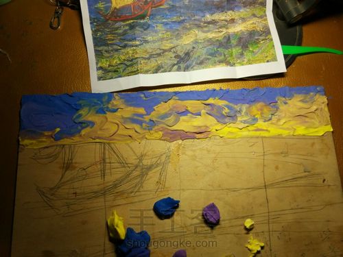 直接用手指把粘土抹在木板上。