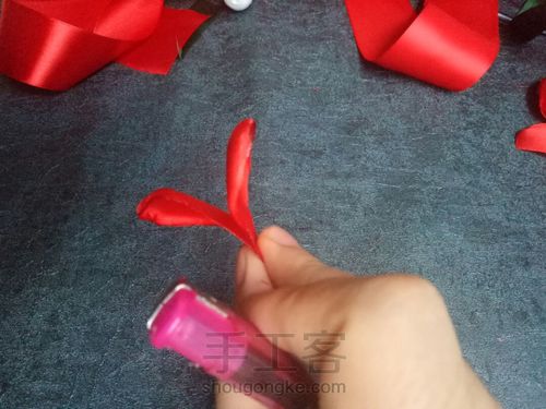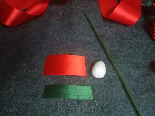 :| 材料:3.8cm的大红丝带(单面) 1.5cm的墨绿色丝带(单面) 玫瑰芯泡沫球1个 带纸花杆一根 |