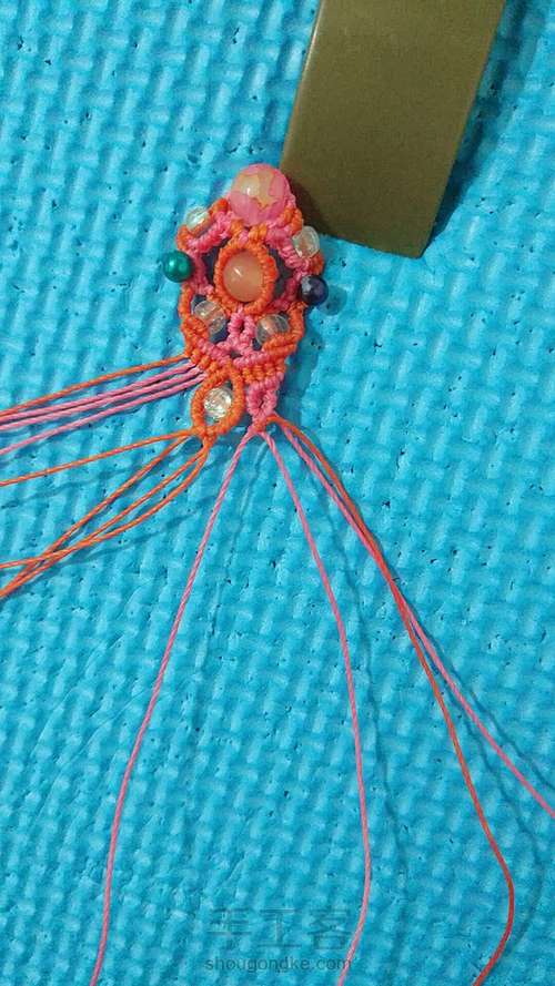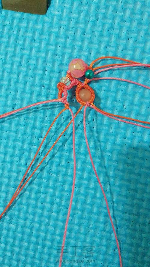 橘色线两根一起穿入一颗珠子,粉色线一根为轴一根为绕线,做三个雀头