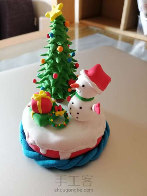 雪人⛄️制作好了(眼睛👀和扣子,现在白色球上,用牙签戳一个小洞,再用黑色粘土摁住。圣诞树🎄和雪人⛄️底部,用牙签插在底座上)
