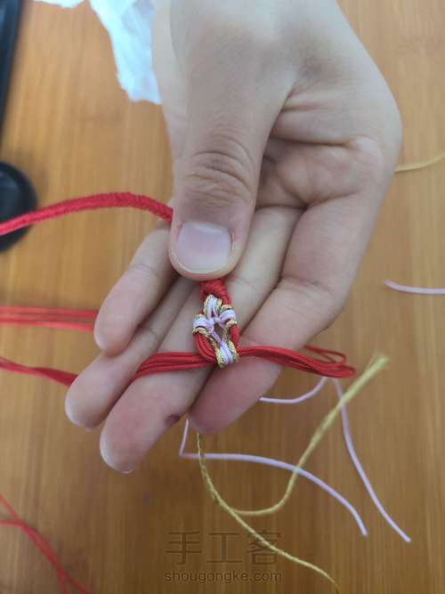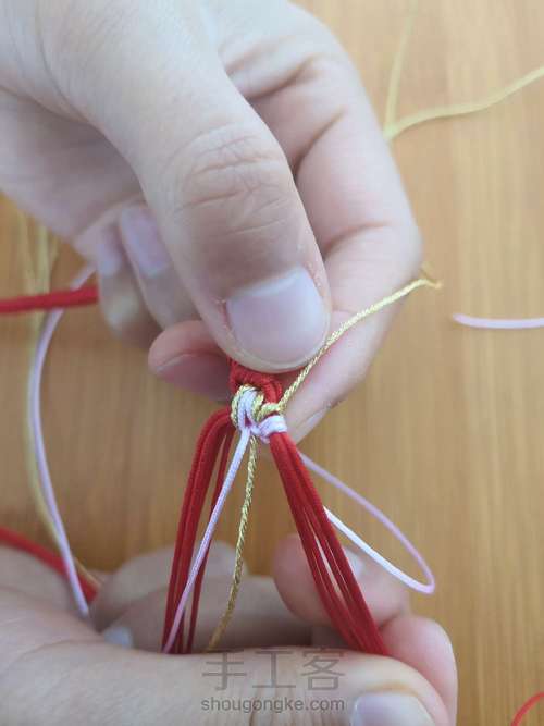 按上图所示,金线和粉色线在红线上打竖雀头结。注意线的摆放顺序