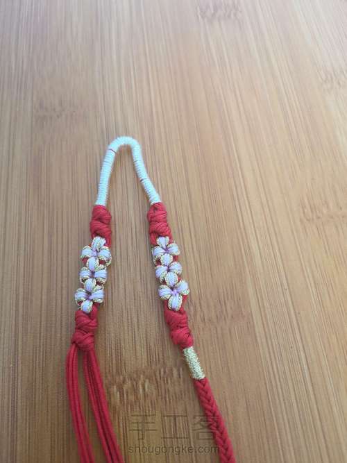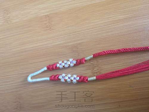 如图,用20厘米长的一根粉色72号玉线和金线股线对折挂红色线上