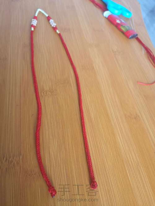 把5根160厘米长的72号红色玉线从中间对折。根据需要选择长度,想要长一点可以留更长的线。