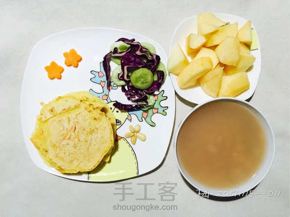 今日早餐:杂粮粥、糊塌子、蔬菜沙拉、苹果、坚果