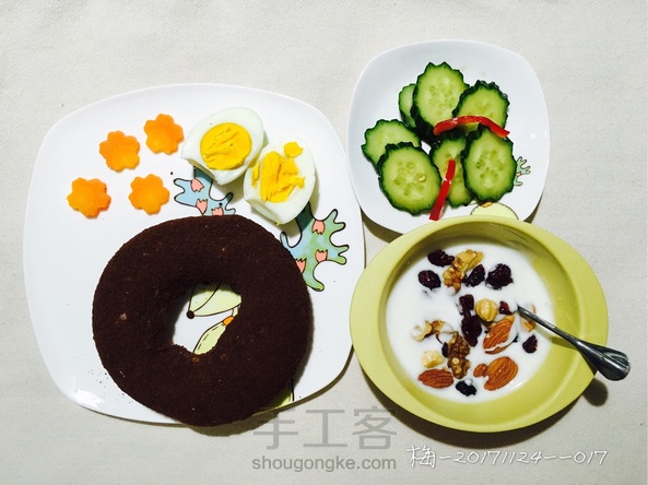 今日早餐:面包圈、坚果酸奶、白煮蛋、拌黄瓜