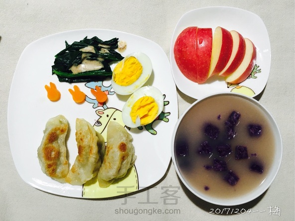 今日早餐:紫薯粥、煎饺、白煮蛋、菠菜、苹果