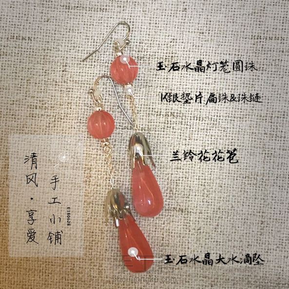 胭脂玲 灵动妩媚新中式耳饰 风格:简约中式 特点:灵动 妩媚 用料:韩式K银小挂钩+进口玉石粉水晶灯笼圆珠++进口玉石粉水晶大水滴坠+兰铃花花托+K银珠链+珠白水晶玉石散珠 长度:总长度约为7cm
