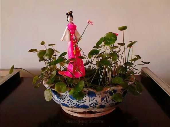 古装仕女配铜钱草盆景,是不是有点何仙姑的感觉?