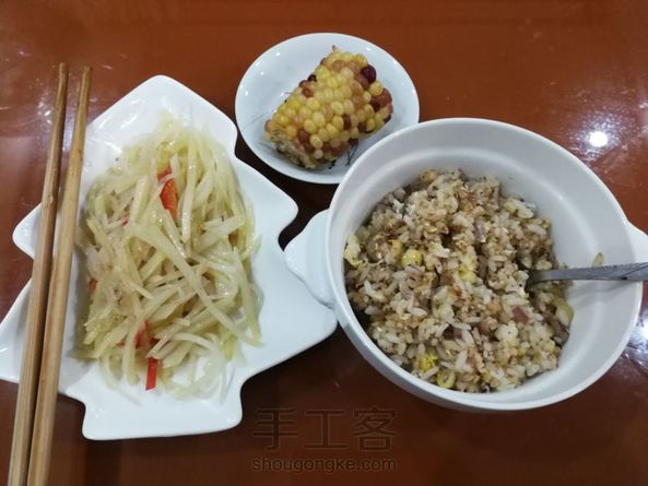 有味的早餐64:玉米洋葱蛋炒饭+醋溜土豆丝+蒸花玉米
