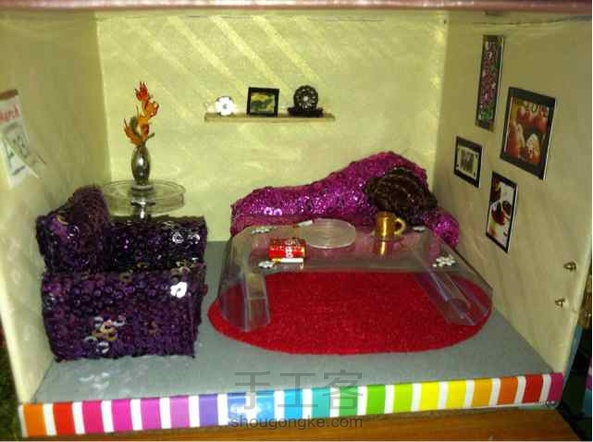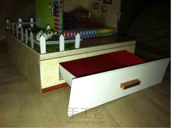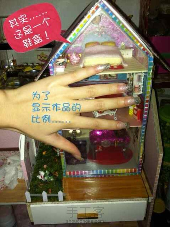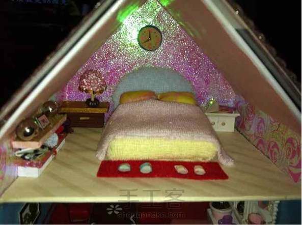 廢物利用,純手工!特別喜歡那個書架和推車,硬紙殼做的。上面的紅酒是小燈泡,一樓的香煙是小木塊磨的,然後用指甲油上色!
