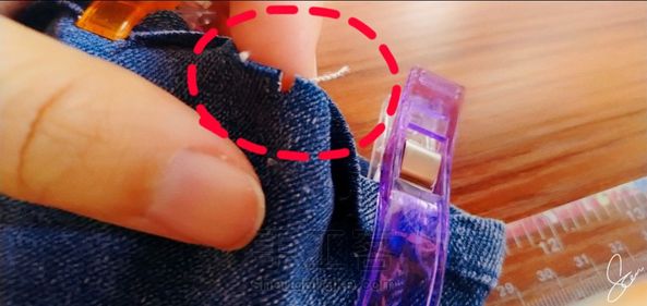 STEP:包边两端和裤脚两端对齐,用夹子固定包边和腿脚。