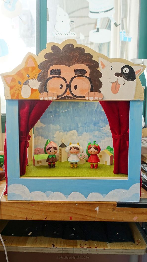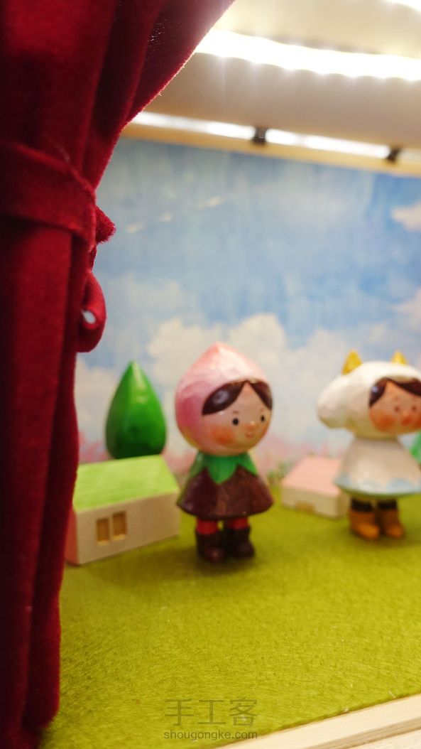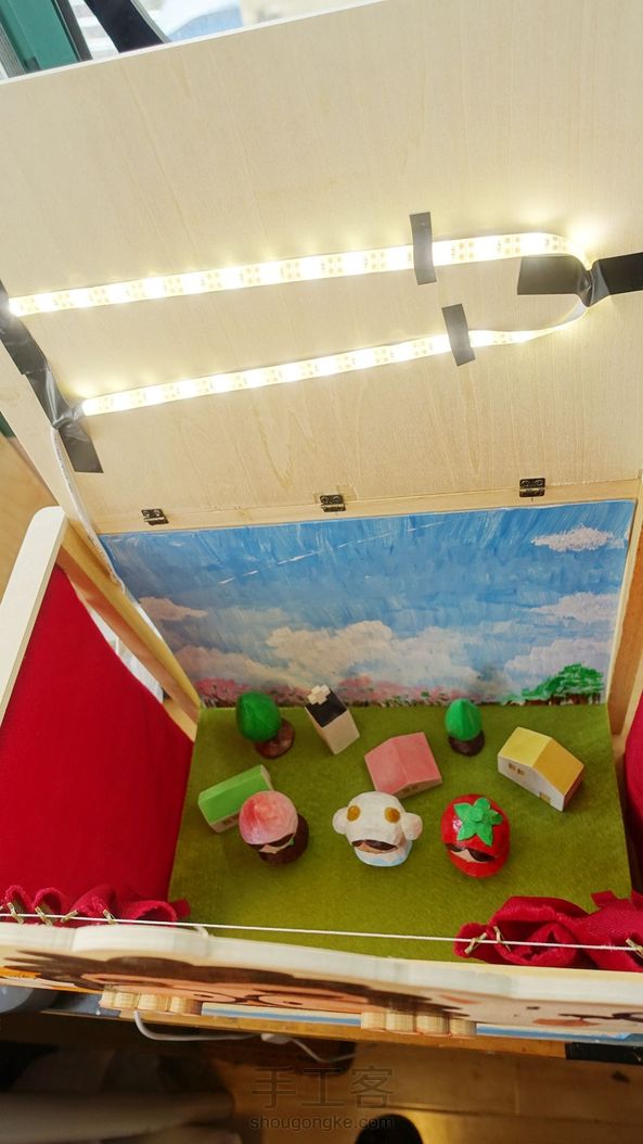 小舞台搭建结束,名字就叫鸡飞狗跳小剧场好了。幕布可合拢拉开,天花板上有闪亮亮的灯带,背景板、地板可更换,可喜可贺可喜可贺。