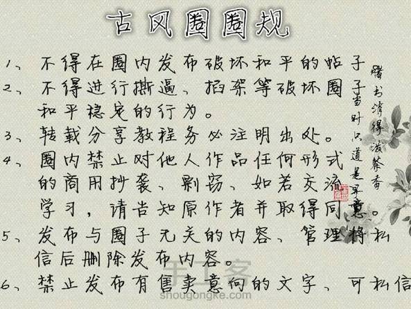 【古风圈圈规】 圈规长的不要不要的、但是一定要仔细看呀很重要! ★为了防止发生盗图现象、发手工圈的时候最好附上自己手写的昵称、或者自己加上水印、这点很重要很重要很重要! ★售卖的话要是有意向可以私信、就不要在手工圈评论里说了、管管看到可能会删圈的 ★古风圈那么大一定要相亲相爱啊千万不要撕逼掐架