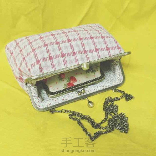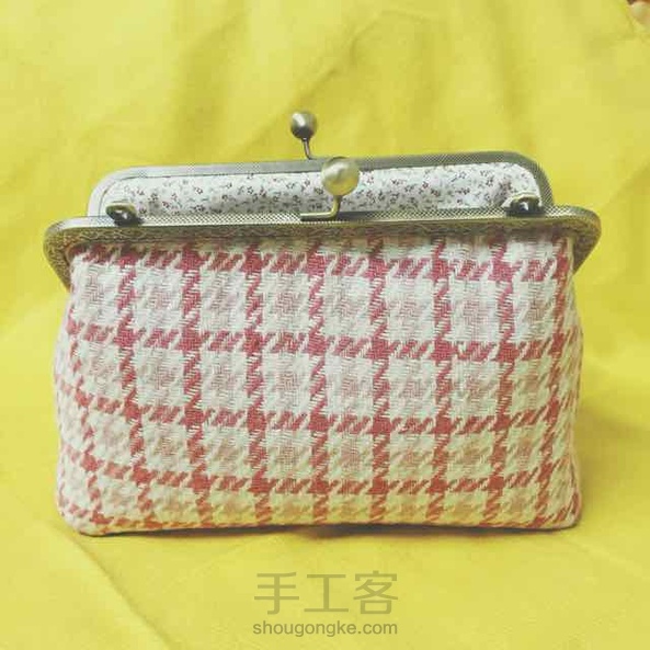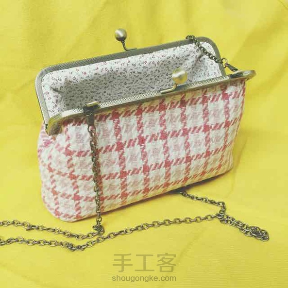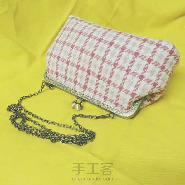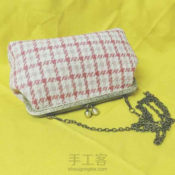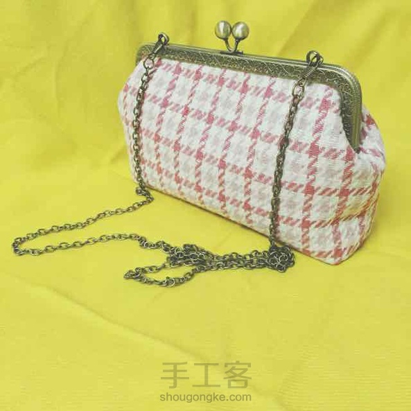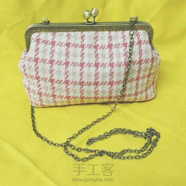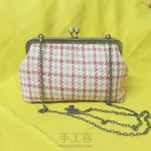 20cm呢子粉色格子斜挎口金包~小清新的感觉~