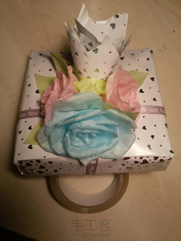 手工礼盒~手揉纸玫瑰粘起来效果真不错(^∇^)Y~