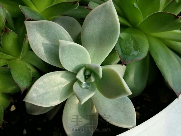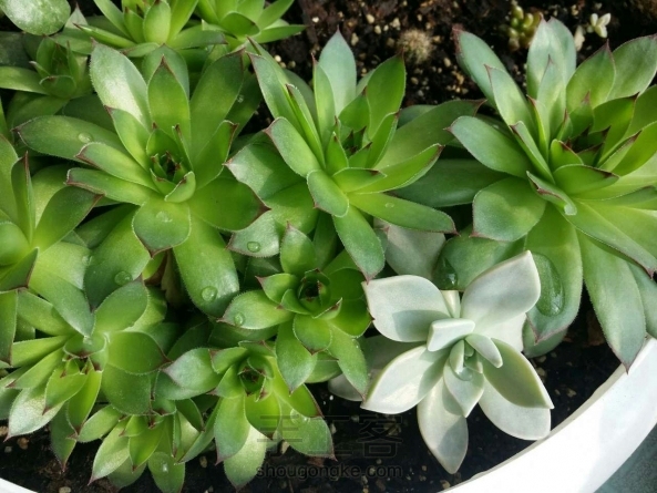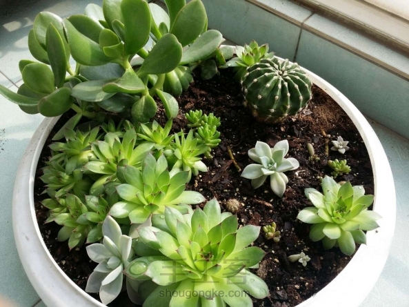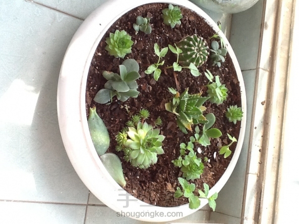 多肉集合。花盆是废物利用吸顶灯罩。 最后一张是刚种下时的模样,大概是去年的5月间,大半年的时间过去了,自己没什么长进,但是种下的肉肉却是繁盛了很多。看现在的翠绿欲滴,很是欣喜。每次在阳光的早晨醒来,总愿意到阳台上多看几眼。