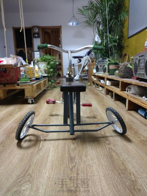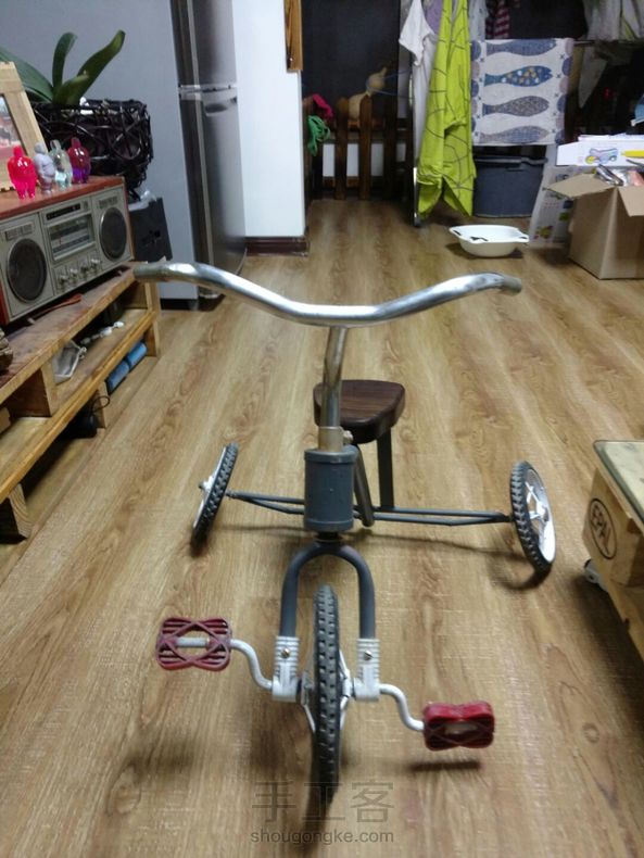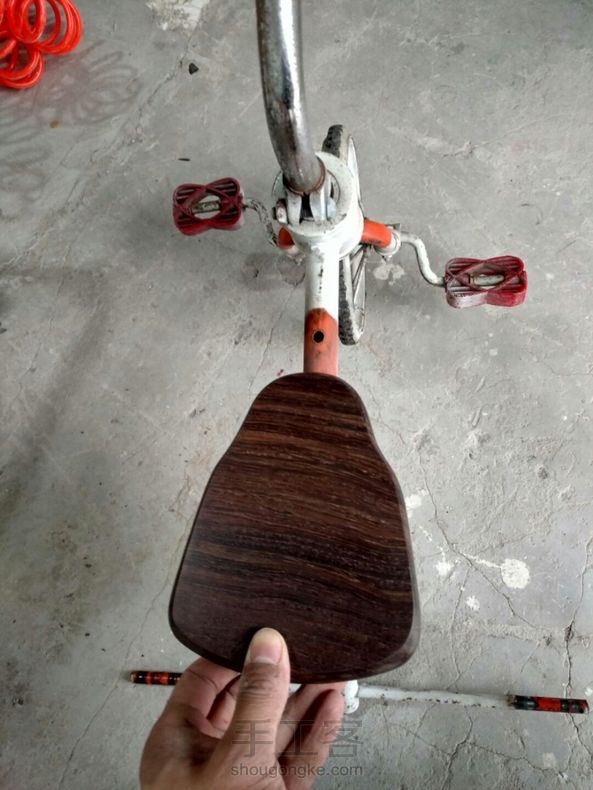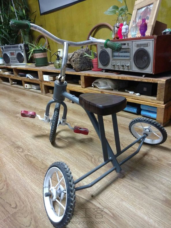 旧童车改装宽体低趴! 折腾一天终于搞定,实木坐包,脚蹬子把套还没来得及磨,有空再做吧!