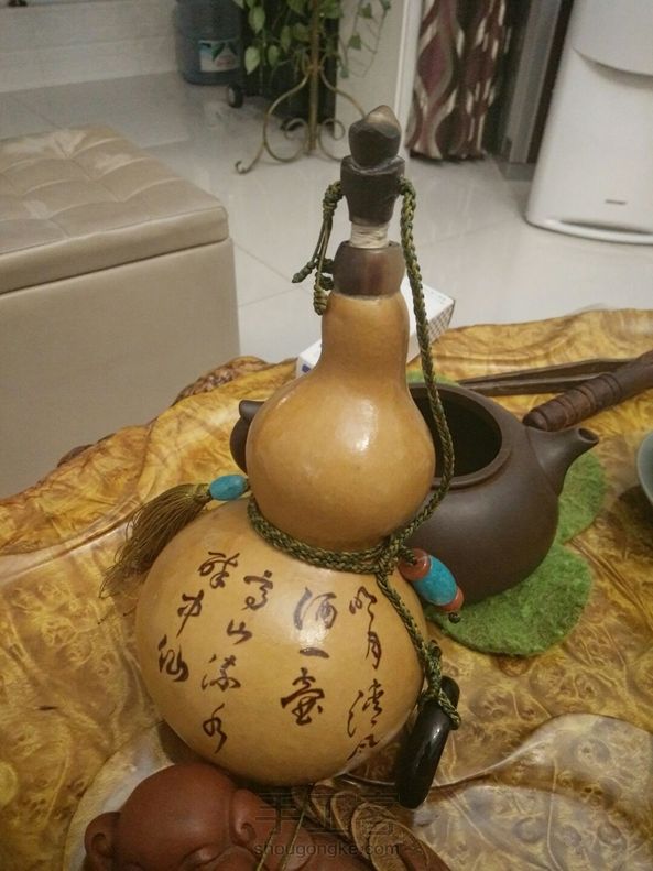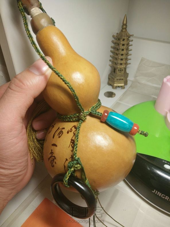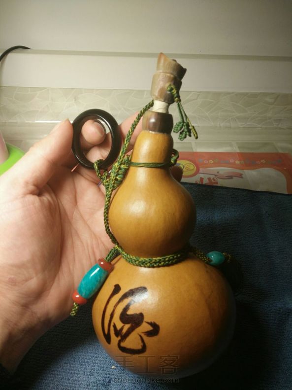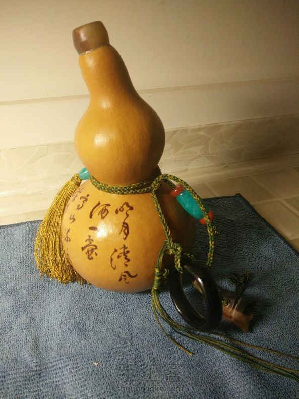 飞鸿酒葫芦,漆艺:35天,纯手工,5次糯米防渗,完美,牦牛角做口,塞子,黑牛角环,自己烙的书法,天河石配南红,加35天的工。