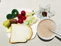 20170926--早餐:面包片、红薯、杂粮粥、豇豆、蔬菜沙拉、火龙果、葡萄干