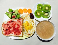 20170927--早餐:杂粮粥、果酱面包、煎蛋、拌黄瓜、胡萝卜、猕猴桃