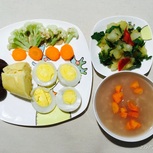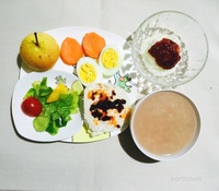 20171009--早餐:杂粮粥、白煮蛋、拌蔬菜、果酱山药、梨