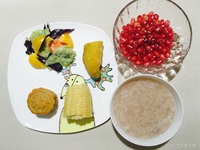 20170929--早餐:粥、月饼、玉米、蔬菜沙拉、石榴、蒸地瓜