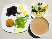 20171010--早餐:杂粮粥、月饼、白煮蛋、木耳、拌土豆、葡萄