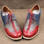 德比鞋,鞋耳是牛仔蓝牛皮布纹效果,中间是编织皮,