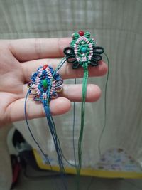 另一个不一样的尾扣。刚擦了护手霜,手亮亮的珠子反光找出来中间像有一条金丝。😂