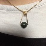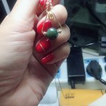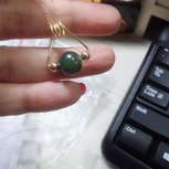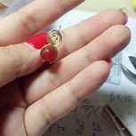 妈妈一共给了3个大珠2个小珠给我,做了两对耳钉后还剩下一个最深色的大珠~~~做了个戒指,但手上的线太软了,效果不好,就绕成吊坠吧……试了几个效果,最后图5是成品,配成一套戴也蛮好看的~~~